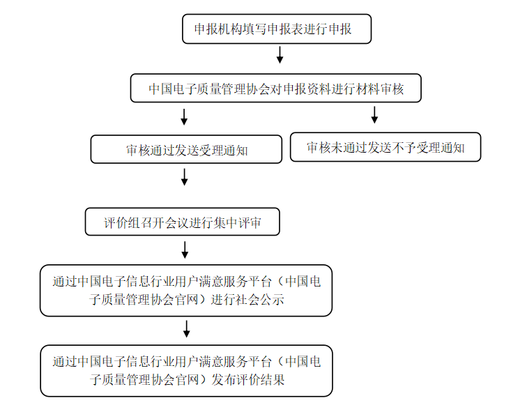 中国电子信息行业用户满意评价准则(试行)中国电子信息行业用户满意评价准则(试行) 第一章总则 第一条 为贯彻《中共中央 国务院关于开展质量提升行动的指导意见》(中发〔2017〕24号),落实工业和信息化部“工业质量品牌建设工作要求”,提升人民群众的质量获得感和消费满意度,持续推进实施中国电子信息行业用户满意评价工作,特制定本办法。 第二条 中国电子信息行业用户满意评价工作面向会员单位,遵循“自愿、公开、公正”原则对机构、产品、工程以及服务进行评价。 第二章组织机构 第三条中国电子信息行业用户满意评价工作由中国电子质量管理协会组织实施,各机构自愿参与申报。 第四条 中国电子质量管理协会根据工作需要,聘任相关领域的专家组成评价组,依据本准则开展中国电子信息行业用户满意评价工作。 第三章评价成员 第五条 中国电子信息行业用户满意评价组由组长、副组长、组员组成。 第六条 中国电子信息行业用户满意评价组成员应具备基本条件: (一)身体健康,年龄不超过70周岁; (二)熟悉用户满意相关工作的法律法规和方针政策; (三)接受过全面质量管理相关知识培训并有丰富的实践工作经验; (四)在所从事领域具有突出业绩和较高声誉; (五)坚持原则,公正廉洁,忠于职守; (六)能严格按照本准则要求开展评价工作。 第七条 评价组成员有下列情形的,应当回避: (一)与申报企业存在任何形式关联关系的,包括本人及近亲属在申报企业任职或离职不满2 年; (二)与申报企业存在任何形式关联关系的,包括本人及近亲属在与申报企业存在竞争关系的单位任职或离职不满2年; (三)与申报机构存在其他可能影响评价结果公正性的其他关系。 第四章申报要求 第八条用户满意申报内容包括:用户满意机构、用户满意产品、用户满意工程、用户满意服务、用户满意杰出管理者申报。 第九条基本条件 (一)正常生产、经营3 年以上的相关机构; (二)有诚信创建意愿,并向社会公开承诺; (三)自觉维护用户满意品牌形象。 第十条 分类申报条件 (一)中国电子信息行业用户满意机构申报条件 1、申报机构认真贯彻实施质量管理标准,对有强制性要求的产品已获认证注册;提供的产品或服务符合相关标准要求; 2、申报机构坚持“用户至上、质量第一”,持续提高用户满意和忠诚度,用户满意度测评结果达到80分以上; 3、申报机构应相关产品(工程)在国家、地方质量监督抽查中合格; 4、申报机构积极履行“双碳”、“安全可信”等社会责任并取得显著成效; 5、申报机构连续两年无重大质量、设备、伤亡、火灾和爆炸事故(按行业规定)及重大用户投诉。 (二)中国电子信息行业用户满意产品申报条件 1、申报产品在国家、地方质量监督抽查中合格; 2、申报产品采用国际或国内先进标准; 3、申报产品应符合绿色发展理念,与“双碳”要求相一致; 4、申报产品用户反映良好,用户满意度测评结果达到80分以上。 (三)中国电子信息行业用户满意工程申报条件 1、申报工程应符合国家或行业设计、施工技术规范和标准要求,并提供验收报告; 2、申报工程在使用过程中没有发现质量问题和隐患; 3、申报工程符合绿色发展理念,与“双碳”要求相一致; 4、申报工程用户反映良好,用户满意度测评结果达到80分以上。 (四)中国电子信息行业用户满意服务项目申报条件 1、申报服务项目贯彻落实国家、行业、地方的服务标准,具有健全的服务质量体系; 2、申报服务项目的服务标准及规范满足用户需求; 3、申报服务项目符合绿色发展理念,与“双碳”要求相一致; 4、申报服务用户反映良好,用户满意度测评结果达到80分以上。 (五)中国电子信息行业用户满意杰出管理者申报条件 1、申报人员至少已领导完成了一项用户满意大型项目,并且此项目获得相关荣誉称号; 2、申报人员在用户满意工作领域具有较高的知名度与美誉度。 第十一条有下列情形之一,不予申报评价 1、近两年内执法监督部门抽查公告为不合格的; 2、近三年内发生重大投诉事项经查属实的; 3、近三年受到相关部门严重行政处罚的; 4、存在其他严重违反法律法规行为的。 第五章评价程序第十二条申报 自愿向中国电子质量管理协会提出申请,并提交如下申报资料: (一)中国电子信息行业用户满意申报表; (二)第三方用户满意度测评报告,测评范围与推荐范围一致; (三)荣誉资质及其他证实性资料。 第十三条 材料审核 (一)中国电子质量管理协会对申报材料进行审核。 (二)对审核通过的机构,向其发出受理通知书。 (三)对不符合条件的机构,向其发出不予受理通知书。 第十四条 专家评价 (一)对于审核通过的机构,由评价组召开会议进行集中评审。 (二)评价组认为需要进一步核实有关情况的,提出具体实施意见并责成相关部门组织落实。 (三)必要时,中国电子质量管理协会组织有关专家抽取部分机构进行现场核实。 第十五条 社会公示 (一)通过中国电子信息行业用户满意服务平台(中国电子质量管理协会官网),公开发布拟授予用户满意称号的名单,征求社会各界意见,公示期一般不少于7日。 (二)公示期间有投诉或异议的,中国电子质量管理协会对投诉或异议所反映的情况进行调查核实并进行评议。 第十六条 通过中国电子信息行业用户满意服务平台(中国电子质量管理协会官网)发布评价结果。 第